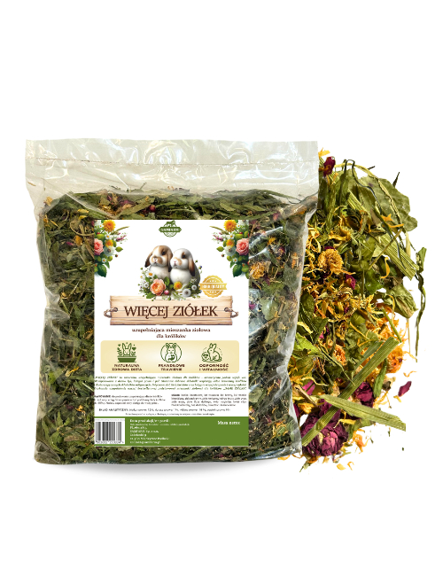 Więcej ziółek to nic innego jak bogatsza siostra Samych ziółek. Mieszanka składa się z 11 składników tak dobranych, aby uzupełniać działanie mieszanki podstawowej i wspierać zdrowie królików każdego dnia. Charakteryzuje się świetnym składem surowcowym i analitycznym, dużymi kawałkami ziół oraz domieszką aromatycznych kwiatów.