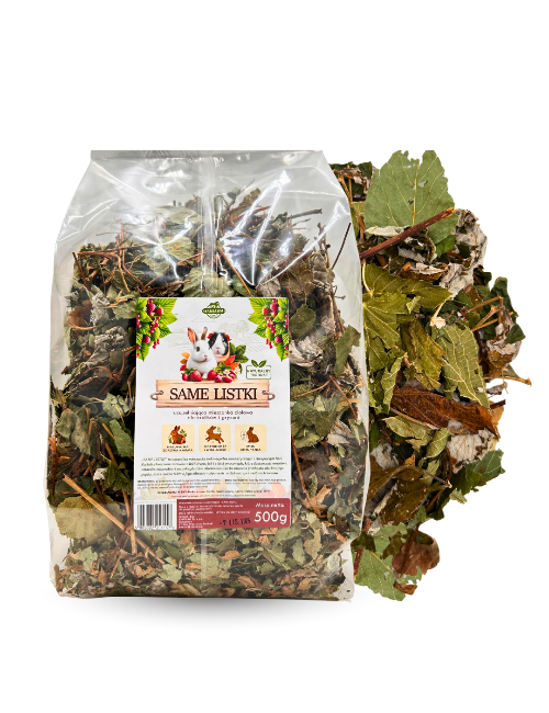 Same listki to świetna propozycja od marki Samfarm na jesień i zimę, kiedy królikom brakuje chrupania i wsparcia odporności. Składa się ona z liści drzew i krzewów owocowych: maliny, truskawki i porzeczki z dodatkiem liści lipy. Liście są wyjątkowo duże i niepokruszone, więc nie tylko dadzą zastrzyk zdrowia, ale i z pewnością ucieszą te uszate, które lubią sobie pochrupać.