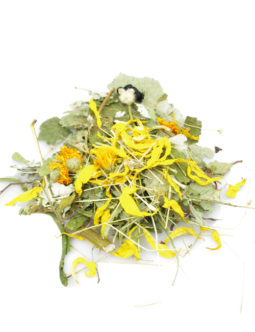 Skład: babka szerokolistna, babka lancetowata, liść maliny, melisa,, mix patyczków, mniszek lekarski, ziele truskawki, lipa, mięta, ziele rumianku, ziele poziomki, ziele topinamburu, nagietek, liść borówki, płatki róży, malwa czarna, płatki słonecznika, rdest ptasi.