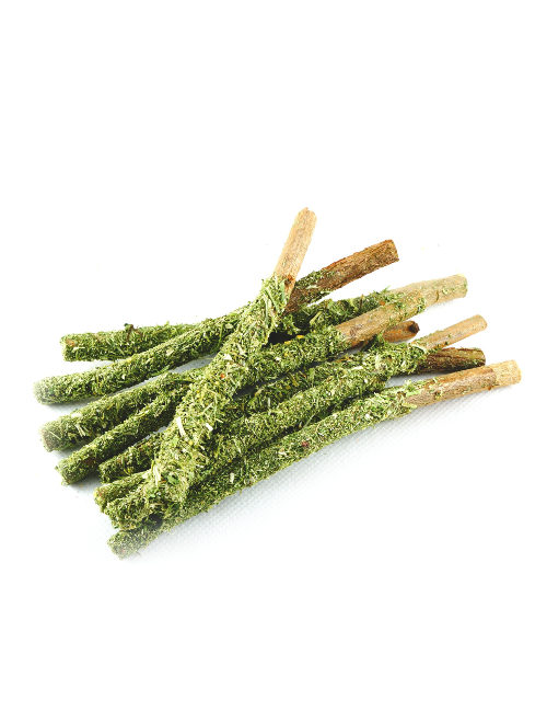 Te zielone gryzaki to młode pędy leszczyny pokryte natką pietruszki. Idealne do zajęcia ząbków na dłuższą chwilę.