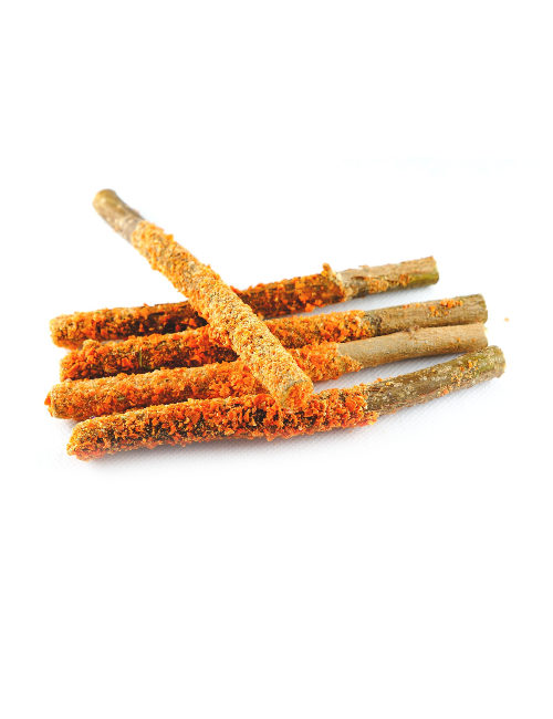 Gryzaki składające się z młodych pędów leszczyny bezpiecznie oklejonych kawałkami marchewki. W opakowaniu znajduje się kilka gałązek.