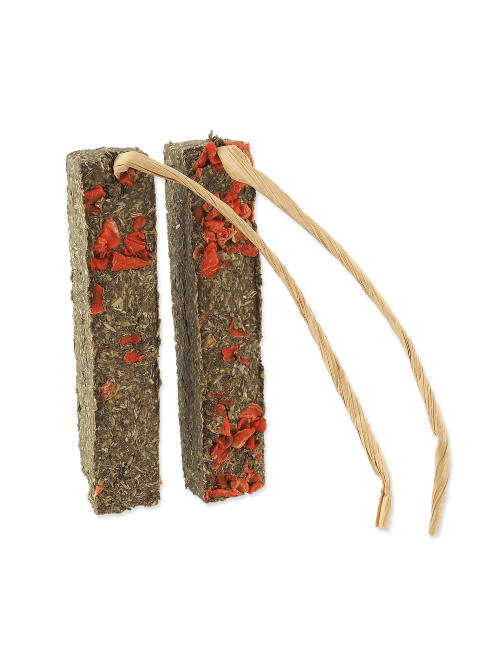 Karma uzupełniająca dla królików i gryzoni nie zawierająca zbóż w formie podłużnych batonów z dodatkiem marchewki.