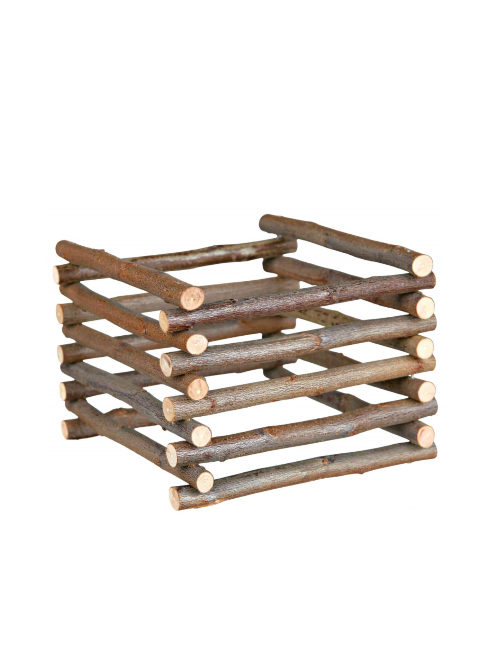 Nieduży paśnik z naturalnego drewna bez kanałów żywicznych – bezpieczny i doskonały do gryzienia, jeśli sianko się skończy.