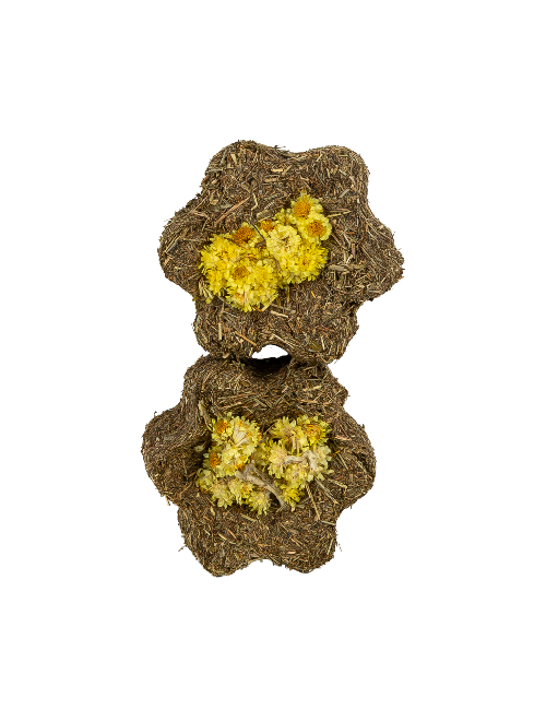 Dwa przysmaki z koniczyną i kocanką dla królika w formie sprasowanych kwiatuszków z traw i dodatków spojonych siemieniem lnianym.